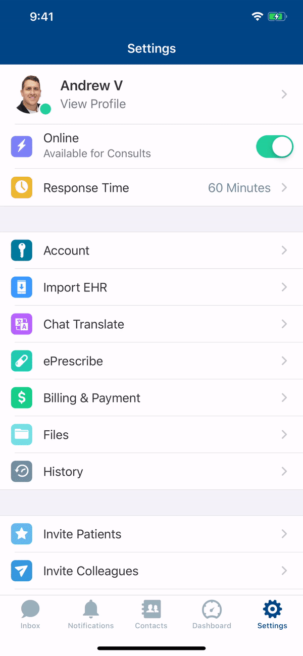 After downloading Direct Health, you will want to set your base rate for a consult. Direct Health also allows you to quickly change your consult rate before you end any consultation, depending on the complexity of the case.